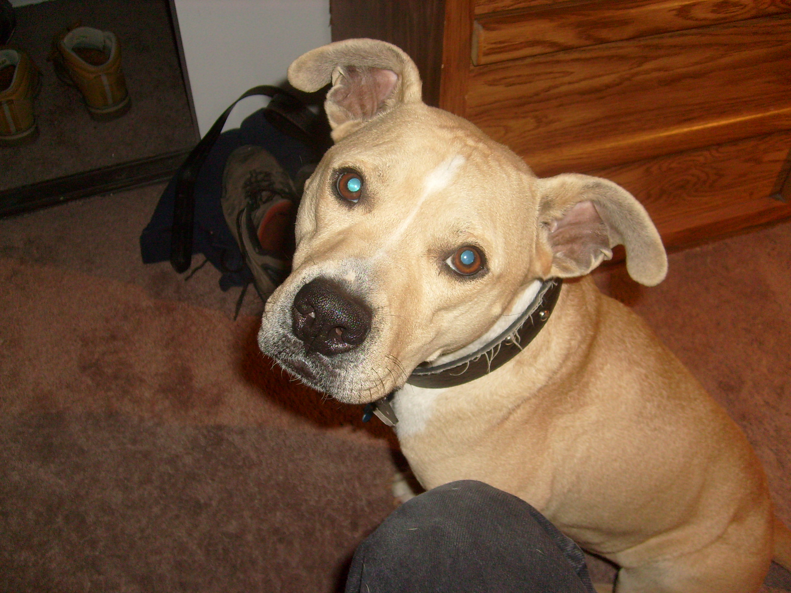 Finally in the last row and the last pen, I see a dog coming running up to the fence, his tail wagging a hundred miles an hour, and he’s licking through the fence. I knew right then this was my new friend, his loving energy had won me over. I had never been a big fan of pit-bulls and certainly had no intention of getting one. But this one was quite “handsome” as I noticed he looked almost like a Labrador with a pit bull mix . He was what is known as a “fawn” pit bull. Most of them don’t have the real wide jaws and frankly they look more docile (less menacing) I believe.